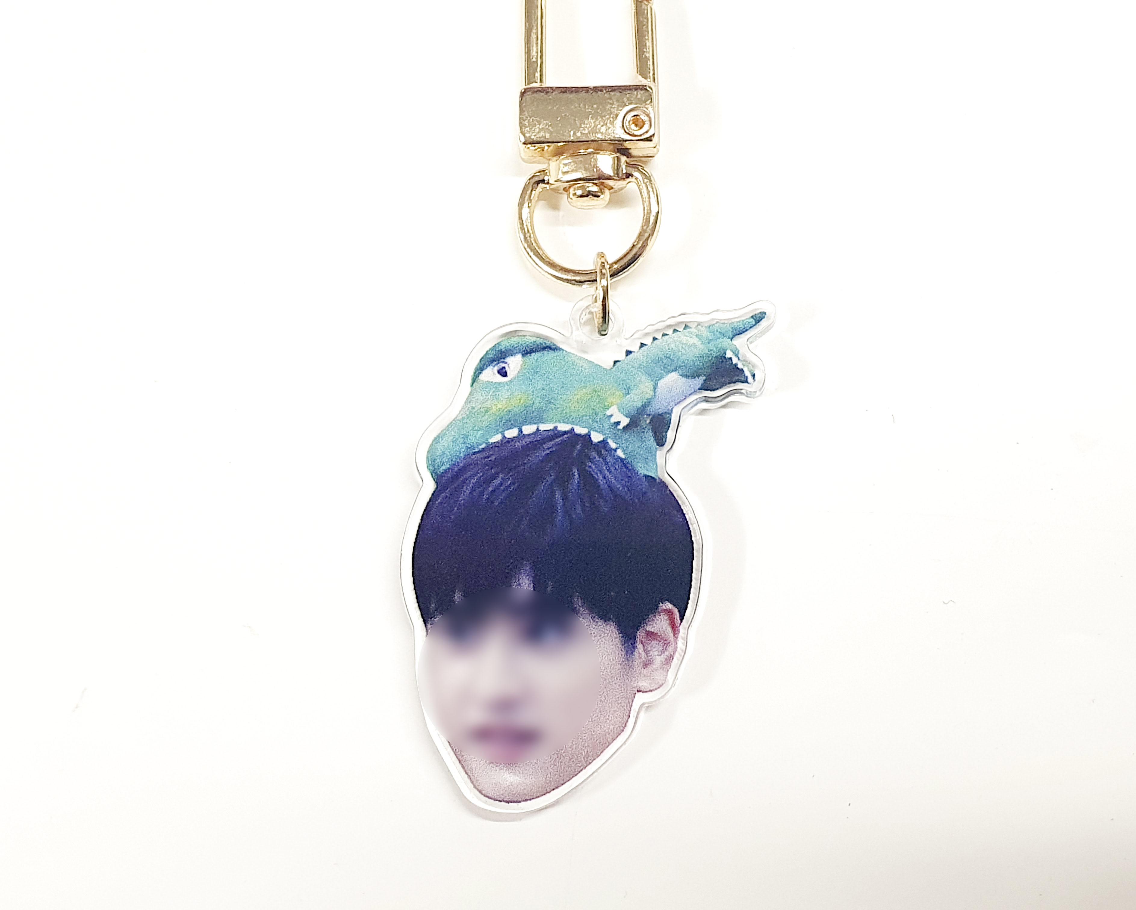 귀여운 공룡모자를 쓴 얼굴이 인쇄된 키링이에요.