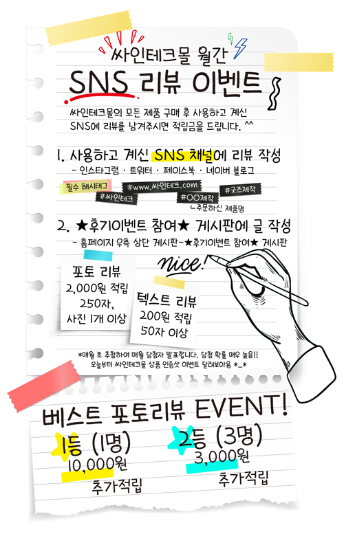 싸인테크 몰의 제품을 구매하시고 사용하고 계신 SNS에 리뷰를 남겨주시면 적립금을 드립니다.