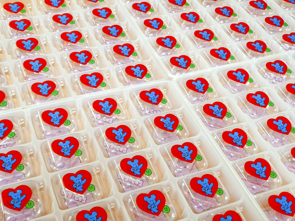 뒷면엔 좀 더 심플하게 다운타운 믹스 주스의 이름과 왕 리본 두개를 인쇄했구요.